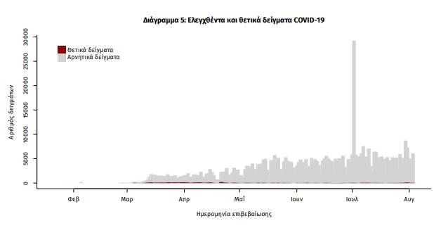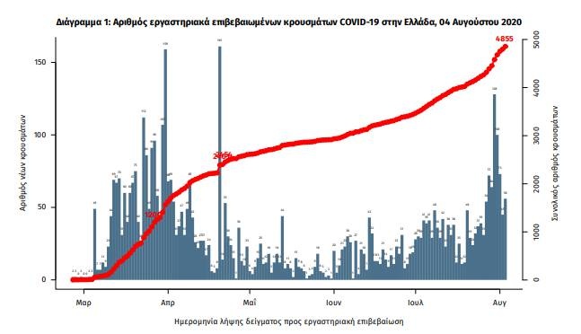 Σήμερα, Τρίτη (04/08), o Εθνικός Οργανισμός Δημόσιας Υγείας (ΕΟΔΥ) ανακοίνωσε 121 νέα κρούσματα του νέου ιού στη χώρα, εκ των οποίων τα 5 εντοπίστηκαν κατόπιν ελέγχων στις πύλες εισόδου της χώρας. Ο συνολικός αριθμός των κρουσμάτων είναι 4.855, εκ των οποίων το 54.6% αφορά άνδρες.