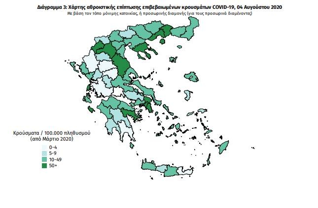 Ο χάρτης αποτυπώνει τη γεωγραφική κατανομή των συνολικών κρουσμάτων COVID-19 (από την αρχή της επιδημίας) ανά Περιφερειακή Ενότητα της χώρας, με βάση την δηλωθείσα διεύθυνση μόνιμης κατοικίας του ασθενούς, ή τη διεύθυνση προσωρινής διαμονής για τους τουρίστες και άλλους προσωρινά διαμένοντες στην Ελλάδα.