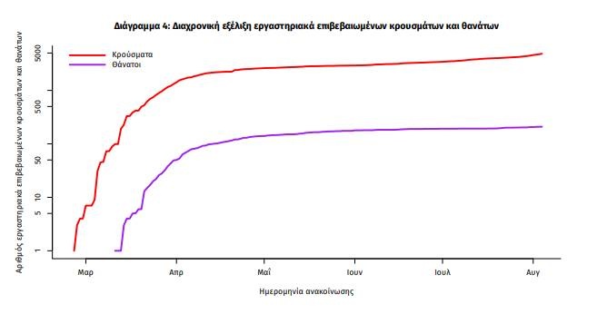 Η διαχρονική εξέλιξη των συνολικών κρουσμάτων και συνολικού αριθμού των θανάτων ασθενών COVID-19 παρουσιάζεται στο ακόλουθο διάγραμμα (σε λογαριθμική κλίμακα).