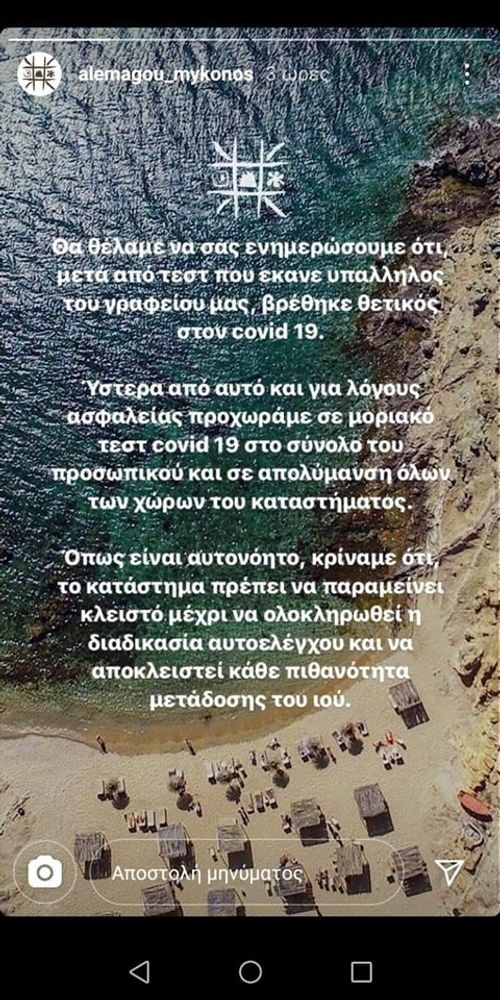 «Θα θέλαμε να σας ενημερώσουμε ότι μετά από τεστ που έκανε υπάλληλος του γραφείου μας, βρέθηκε θετικός στην Covid-19. Ύστερα από αυτό και για λόγους ασφαλείας, προχωράμε σε μοριακό τεστ Covid-19 στο σύνολο του προσωπικού και σε απολύμανση όλων των χώρων του καταστήματος. Όπως είναι αυτονόητο, κρίναμε ότι το κατάστημα πρέπει να παραμείνει κλειστό μέχρι να ολοκληρωθεί η διαδικασία αυτοελέγχου και να αποκλειστεί κάθε πιθανότητα μετάδοσης του ιού», αναφέρει η επιχείρηση σε ανάρτηση στο Instagram.