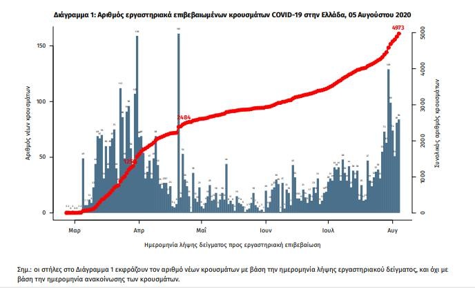 Σήμερα, Τετάρτη (05/08), o Εθνικός Οργανισμός Δημόσιας Υγείας (ΕΟΔΥ) ανακοίνωσε 124 νέα κρούσματα του νέου ιού στη χώρα, εκ των οποίων τα 15 εντοπίστηκαν κατόπιν ελέγχων στις πύλες εισόδου της χώρας. Ο συνολικός αριθμός των κρουσμάτων είναι 4.973, εκ των οποίων το 54.6% αφορά άνδρες.