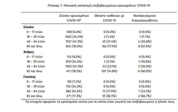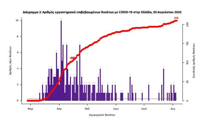 Τέλος, έχουμε 1 ακόμα καταγεγραμμένο θάνατο και 210 θανάτους συνολικά στη χώρα. Οι 67 (31.9%) γυναίκες και οι υπόλοιποι άνδρες. Η διάμεση ηλικία των θανόντων συμπολιτών μας ήταν τα 76 έτη και το 95.7% είχε κάποιο υποκείμενο νόσημα ή/και ηλικία 70 ετών και άνω.