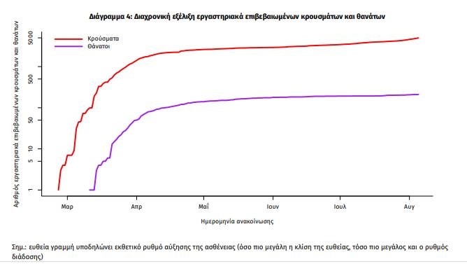 Η διαχρονική εξέλιξη των συνολικών κρουσμάτων και συνολικού αριθμού των θανάτων ασθενών COVID-19 παρουσιάζεται στο ακόλουθο διάγραμμα (σε λογαριθμική κλίμακα).