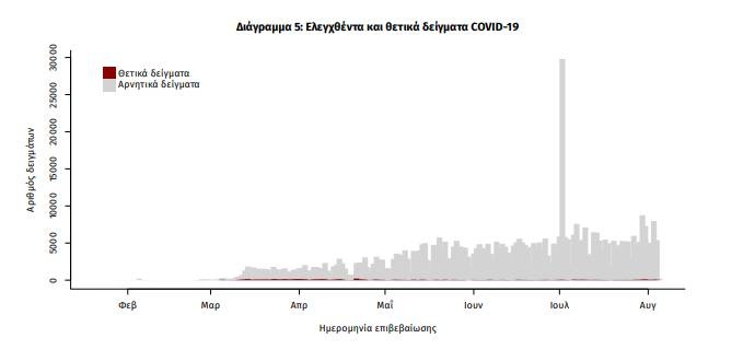 Δείγματα που έχουν ελεγχθεί στα συνεργαζόμενα με τον ΕΟΔΥ εργαστήρια: Από την 1η Ιανουαρίου 2020 μέχρι σήμερα, στα εργαστήρια που διενεργούν ελέγχους για τον νέο κορονοϊό (SARS-CoV-2) και που δηλώνουν συστηματικά στον ΕΟΔΥ το σύνολο των δειγμάτων που ελέγχουν (θετικά και αρνητικά), έχουν συνολικά ελεγχθεί 609.583 κλινικά δείγματα, εκ των οποίων τα 6.876(1.13%) ήταν θετικά στον κορονοϊό (συμπεριλαμβάνονται και περισσότερα από ένα δείγματα ανά άτομο που ελέγχθηκε).