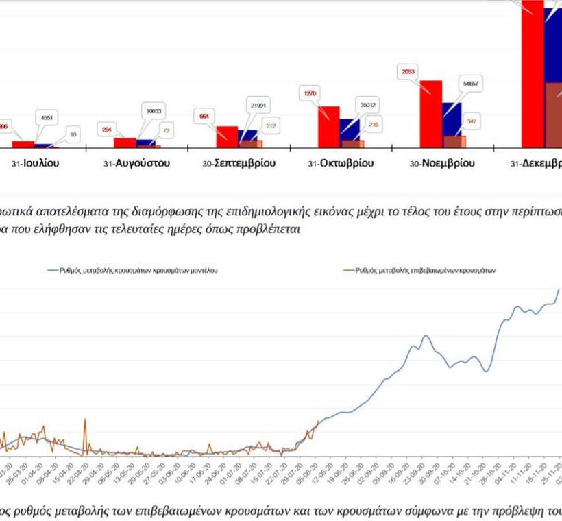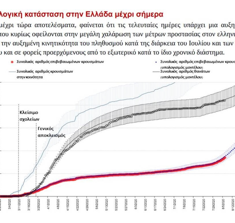 Αν συνεχιστεί η παρατηρούμενη χαλάρωση και για το υπόλοιπο της θερινής περιόδου στο τέλος Σεπτεμβρίου θα έχουμε γύρω στα 430 κρούσματα ημερησίως και συσσωρευτικά 22000 κρούσματα από την αρχή της πανδημίας από τα 5420 που έχουμε σήμερα. Εάν δεν ανακοπεί η πορεία εξάπλωσης του ιού, ο ρυθμός αύξησης των κρουσμάτων θα φτάσει τα 573 στο τέλος Οκτωβρίου και αναμένεται να ξεπεράσει τα 700 ανά ημέρα μέχρι το τέλος του 2020 θέτοντας σε αφόρητη πίεση το εθνικό σύστημα υγείας.