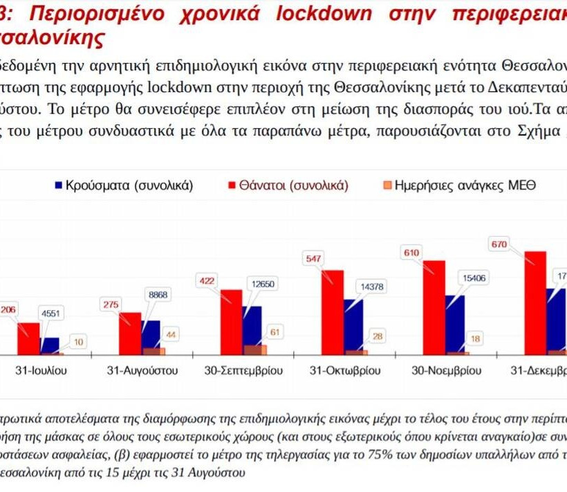 Με δεδομένη την αρνητική επιδημιολογική εικόνα στην περιφερειακή ενότητα Θεσσαλονίκης, αναλύουμε και την περίπτωση της εφαρμογής lockdown στην περιοχή της Θεσσαλονίκης μετά το Δεκαπενταύγουστο και μέχρι τις 31 Αυγούστου. Το μέτρο θα συνεισέφερε επιπλέον στη μείωση της διασποράς του ιού».