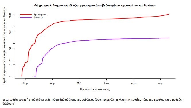 Η διαχρονική εξέλιξη των συνολικών κρουσμάτων και συνολικού αριθμού των θανάτων ασθενών COVID-19 παρουσιάζεται στο ακόλουθο διάγραμμα (σε λογαριθμική κλίμακα).