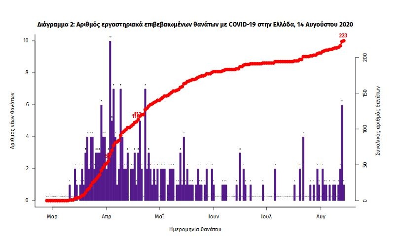 Οι νέοι θάνατοι ασθενών με COVID-19 είναι 2, ενώ από την έναρξη της επιδημίας έχουν καταγραφεί συνολικά 223 θάνατοι. Η μέση ηλικία των ασθενών που απεβίωσαν είναι 77 έτη.