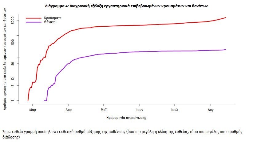 Η διαχρονική εξέλιξη των συνολικών κρουσμάτων και συνολικού αριθμού των θανάτων ασθενών COVID-19 παρουσιάζεται στο ακόλουθο διάγραμμα (σε λογαριθμική κλίμακα).