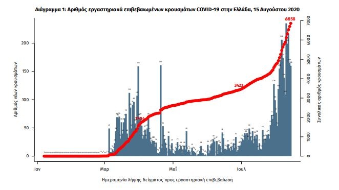 Τα νέα εργαστηριακά επιβεβαιωμένα κρούσματα της νόσου είναι 230, εκ των οποίων τα 27 εντοπίστηκαν κατόπιν ελέγχων στις πύλες εισόδου της χώρας. Ο συνολικός αριθμός των κρουσμάτων ανέρχεται σε 6.858 (ημερήσια μεταβολή +3.5%), εκ των οποίων 55.1% άνδρες.