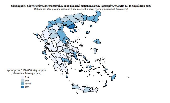 Ο χάρτης αποτυπώνει τη γεωγραφική κατανομή των συνολικών κρουσμάτων COVID-19 (από την αρχή της επιδημίας) ανά Περιφερειακή Ενότητα της χώρας, με βάση την δηλωθείσα διεύθυνση μόνιμης κατοικίας του ασθενούς, ή τη διεύθυνση προσωρινής διαμονής για τους τουρίστες και άλλους προσωρινά διαμένοντες στην Ελλάδα.