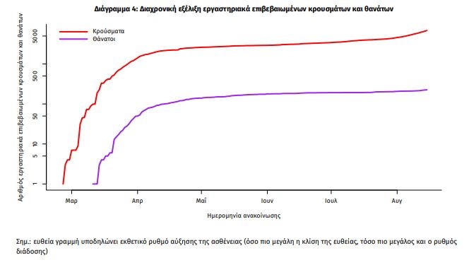 Η διαχρονική εξέλιξη των συνολικών κρουσμάτων και συνολικού αριθμού των θανάτων ασθενών COVID-19 παρουσιάζεται στο ακόλουθο διάγραμμα (σε λογαριθμική κλίμακα).