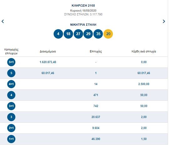 Οι τυχεροί αριθμοί που ανέδειξε η κληρωτίδα της αποψινής κλήρωσης είναι οι: 4, 18, 27, 29, 35 και Τζόκερ ο αριθμός 20.