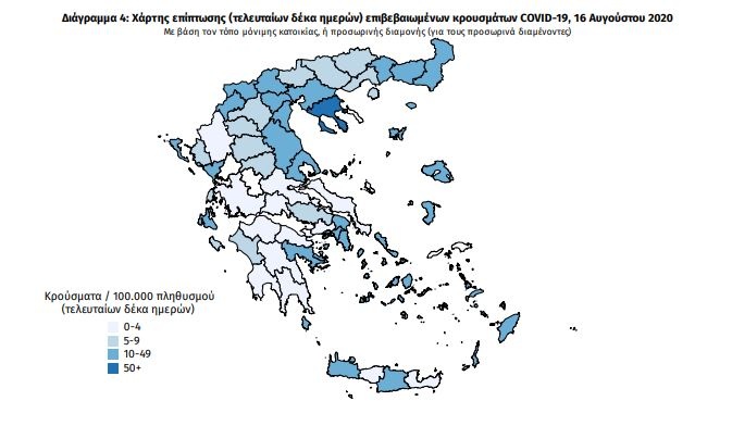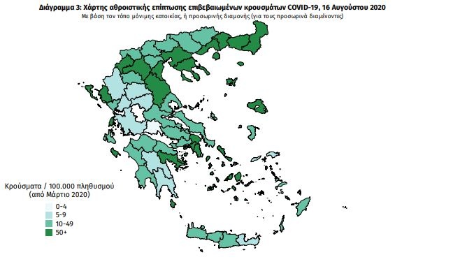 Ο χάρτης αποτυπώνει τη γεωγραφική κατανομή των συνολικών κρουσμάτων COVID-19 (από την αρχή της επιδημίας) ανά Περιφερειακή Ενότητα της χώρας, με βάση την δηλωθείσα διεύθυνση μόνιμης κατοικίας του ασθενούς, ή τη διεύθυνση προσωρινής διαμονής για τους τουρίστες και άλλους προσωρινά διαμένοντες στην Ελλάδα.