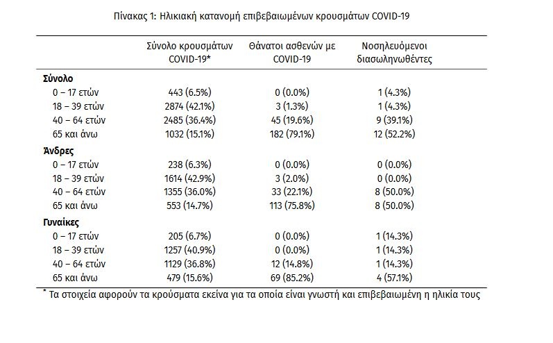 Η μέση ηλικία των κρουσμάτων είναι 40 έτη (εύρος 0 έως 102 ετών), ενώ η μέση ηλικία των θανάτων είναι 77 έτη (εύρος 35 έως 102ετών). Η ηλικιακή κατανομή των (α) συνολικών κρουσμάτων, (β) των περιστατικών που κατέληξαν σε θάνατο και (γ) των ασθενών που νοσηλεύονται διασωληνωμένοι, είναι η ακόλουθη: