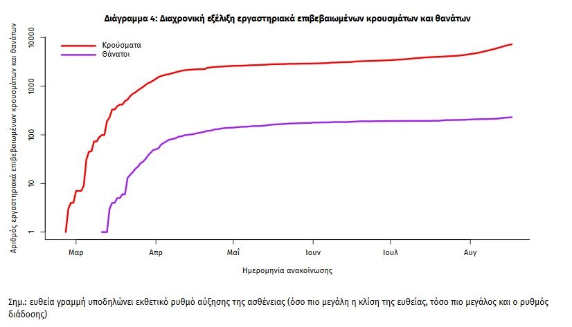 Η διαχρονική εξέλιξη των συνολικών κρουσμάτων και συνολικού αριθμού των θανάτων ασθενών COVID-19 παρουσιάζεται στο ακόλουθο διάγραμμα (σε λογαριθμική κλίμακα).