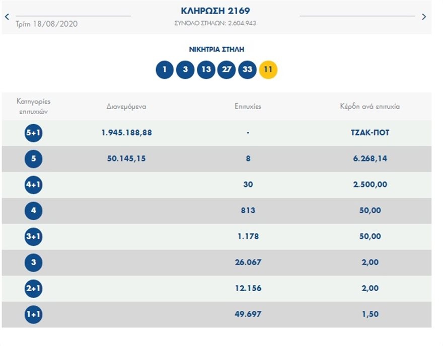 Οι τυχεροί αριθμοί που ανέδειξε η κληρωτίδα της αποψινής κλήρωσης είναι οι: 1, 3, 13, 27, 33 και Τζόκερ ο αριθμός 11.
