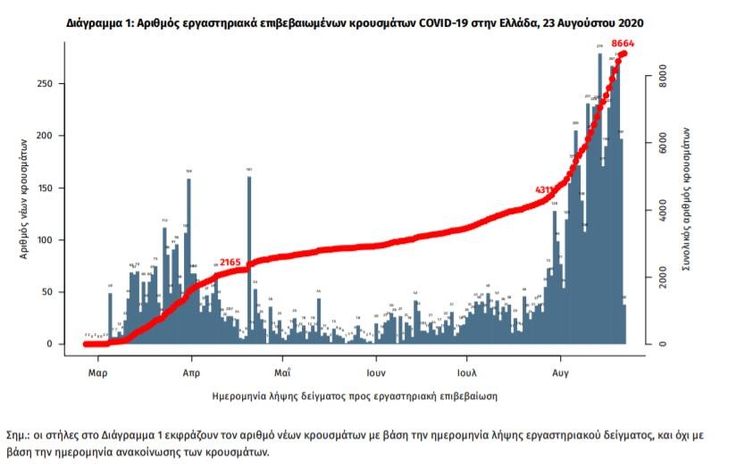 Τα στοιχεία που παρουσιάζονται αφορούν περιστατικά από την επιδημιολογική επιτήρηση της νόσου από το νέο κορoνοϊό (COVID19), με βάση τα δεδομένα που έχουν δηλωθεί στον ΕΟΔΥ και καταγραφεί μέχρι τις 23 Αυγούστου 2020 (ώρα 15:00).