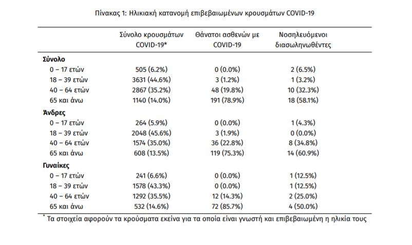 Τέλος, έχουμε 2 ακόμα καταγεγραμμένους θανάτους και 242 θανάτους συνολικά στη χώρα. Οι 84 (34.7%) γυναίκες και οι υπόλοιποι άνδρες. Η διάμεση ηλικία των θανόντων συμπολιτών μας ήταν τα 77 έτη και το 94.6% είχε κάποιο υποκείμενο νόσημα ή/και ηλικία 70 ετών και άνω.