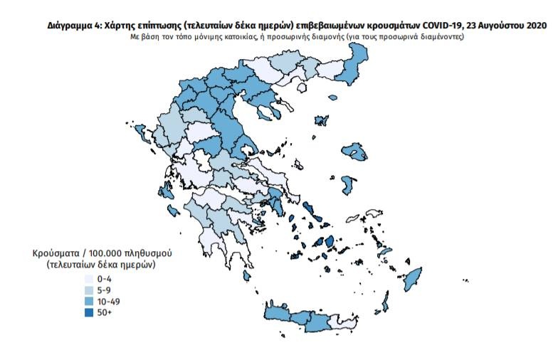 Ο χάρτης αποτυπώνει τη γεωγραφική κατανομή των συνολικών κρουσμάτων COVID-19 (από την αρχή της επιδημίας) ανά Περιφερειακή Ενότητα της χώρας, με βάση την δηλωθείσα διεύθυνση μόνιμης κατοικίας του ασθενούς, ή τη διεύθυνση προσωρινής διαμονής για τους τουρίστες και άλλους προσωρινά διαμένοντες στην Ελλάδα. Συμπεριλαμβάνονται τόσο κρούσματα με ιστορικό ταξιδίου (“εισαγόμενα”) όσο και κρούσματα με πιθανή εγχώρια μετάδοση.