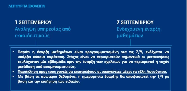 Παρότι η έναρξη μαθημάτων είναι προγραμματισμένη για τις 7/9, ενδέχεται να υπάρξει κάποια παράταση. Στόχος είναι να περιοριστούν σημαντικά οι μετακινήσεις τουλάχιστον 1 εβδομάδα πριν την έναρξη των σχολείων για να περιοριστεί η τυχόν μετάδοση από ασυμπτωματικούς.