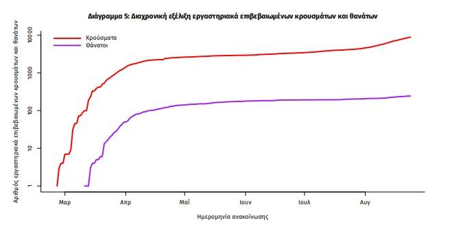 Η διαχρονική εξέλιξη των συνολικών κρουσμάτων και συνολικού αριθμού των θανάτων ασθενών COVID-19 παρουσιάζεται στο ακόλουθο διάγραμμα (σε λογαριθμική κλίμακα).
