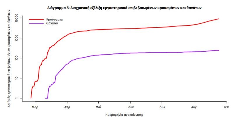 Η διαχρονική εξέλιξη των συνολικών κρουσμάτων και συνολικού αριθμού των θανάτων ασθενών COVID-19 παρουσιάζεται στο ακόλουθο διάγραμμα (σε λογαριθμική κλίμακα).
