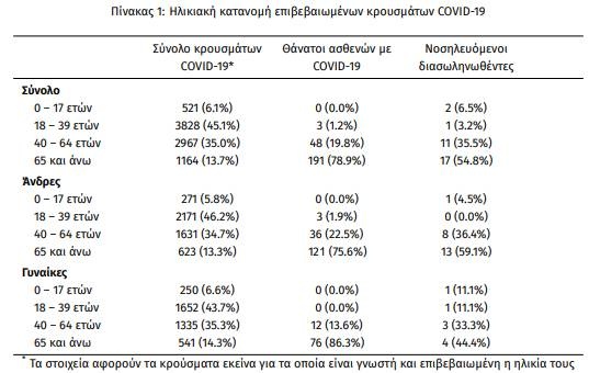 Η μέση ηλικία των κρουσμάτων είναι 39 έτη (εύρος 0 έως 102 ετών), ενώ η μέση ηλικία των θανάτων είναι 77 έτη (εύρος 35 έως 102 ετών). Η ηλικιακή κατανομή των (α) συνολικών κρουσμάτων, (β) των περιστατικών που κατέληξαν σε θάνατο και (γ) των ασθενών που νοσηλεύονται διασωληνωμένοι, είναι η ακόλουθη: