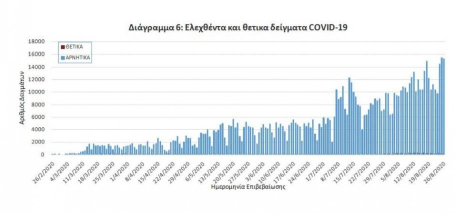 Δείγματα που έχουν ελεγχθεί στα συνεργαζόμενα με τον ΕΟΔΥ εργαστήρια: Από την 1η Ιανουαρίου 2020 μέχρι σήμερα, στα εργαστήρια που διενεργούν ελέγχους για τον νέο κορονοϊό (SARS-CoV-2) και που δηλώνουν συστηματικά στον ΕΟΔΥ το σύνολο των δειγμάτων που ελέγχουν (θετικά και αρνητικά), έχουν συνολικά ελεγχθεί 903.432 κλινικά δείγματα, εκ των οποίων τα 10.103(1.12%) ήταν θετικά στον κορονοϊό (συμπεριλαμβάνονται και περισσότερα από ένα δείγματα ανά άτομο που ελέγχθηκε).