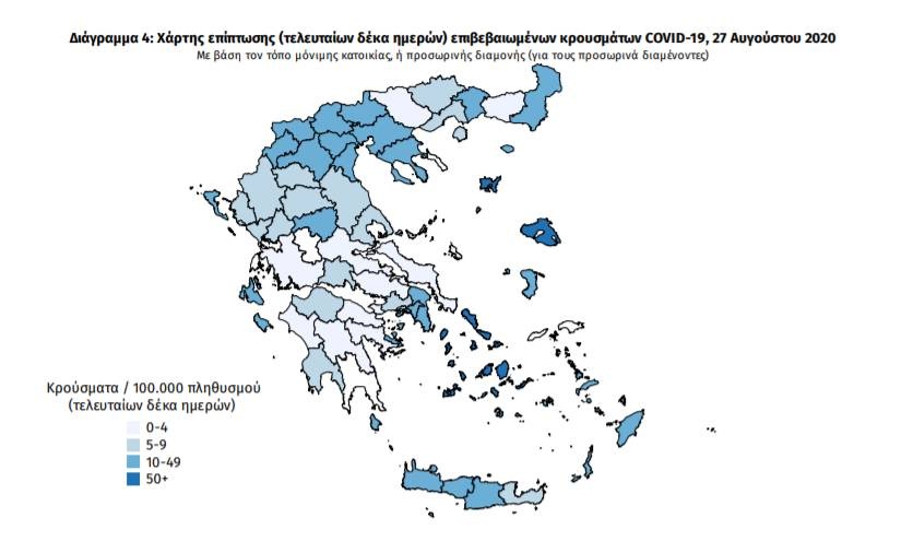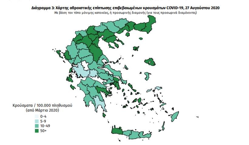 Ο χάρτης αποτυπώνει τη γεωγραφική κατανομή των συνολικών κρουσμάτων COVID-19 (από την αρχή της επιδημίας) ανά Περιφερειακή Ενότητα της χώρας, με βάση την δηλωθείσα διεύθυνση μόνιμης κατοικίας του ασθενούς, ή τη διεύθυνση προσωρινής διαμονής για τους τουρίστες και άλλους προσωρινά διαμένοντες στην Ελλάδα. Συμπεριλαμβάνονται τόσο κρούσματα με ιστορικό ταξιδίου («εισαγόμενα») όσο και κρούσματα με πιθανή εγχώρια μετάδοση.