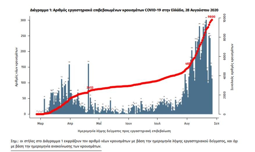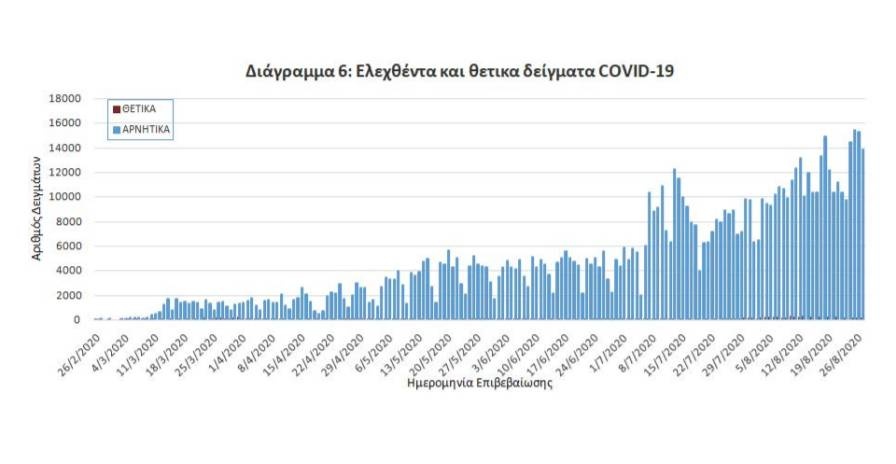 Δείγματα που έχουν ελεγχθεί στα συνεργαζόμενα με τον ΕΟΔΥ εργαστήρια: Από την 1η Ιανουαρίου 2020 μέχρι σήμερα, στα εργαστήρια που διενεργούν ελέγχους για τον νέο κορονοϊό (SARS-CoV-2) και που δηλώνουν συστηματικά στον ΕΟΔΥ το σύνολο των δειγμάτων που ελέγχουν (θετικά και αρνητικά), έχουν συνολικά ελεγχθεί 917.265 κλινικά δείγματα, εκ των οποίων τα 10.342 (1.12%) ήταν θετικά στον κορoνοϊό (συμπεριλαμβάνονται και περισσότερα από ένα δείγματα ανά άτομο που ελέγχθηκε).