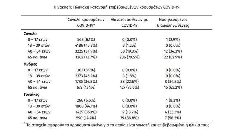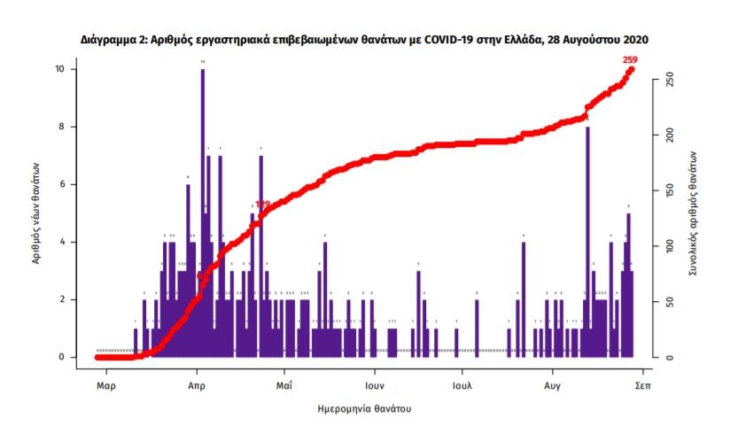 Τέλος, έχουμε 5 ακόμα καταγεγραμμένους θανάτους και 259 θανάτους συνολικά στη χώρα. Οι 91 (35.1%) γυναίκες και οι υπόλοιποι άνδρες. Η διάμεση ηλικία των θανόντων συμπολιτών μας ήταν τα 78 έτη και το 93.8% είχε κάποιο υποκείμενο νόσημα ή/και ηλικία 70 ετών και άνω.