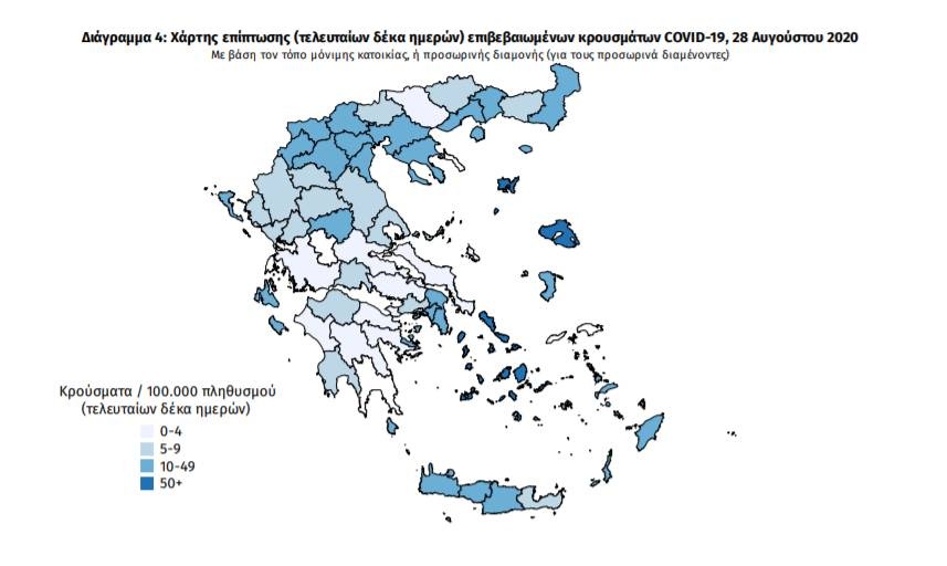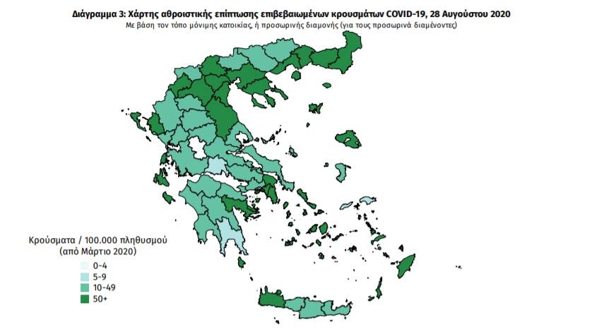 Ο χάρτης αποτυπώνει τη γεωγραφική κατανομή των συνολικών κρουσμάτων COVID-19 (από την αρχή της επιδημίας) ανά Περιφερειακή Ενότητα της χώρας, με βάση την δηλωθείσα διεύθυνση μόνιμης κατοικίας του ασθενούς, ή τη διεύθυνση προσωρινής διαμονής για τους τουρίστες και άλλους προσωρινά διαμένοντες στην Ελλάδα. Συμπεριλαμβάνονται τόσο κρούσματα με ιστορικό ταξιδίου («εισαγόμενα») όσο και κρούσματα με πιθανή εγχώρια μετάδοση.