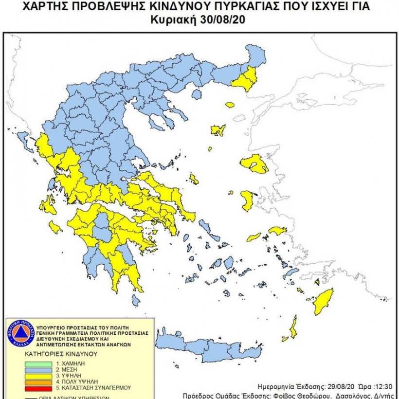 Φωτιές στην Ελλάδα - Όλες οι ειδήσεις: Σύμφωνα με το Χάρτη Πρόβλεψης Κινδύνου Πυρκαγιάς που εκδίδει η Γενική Γραμματεία Πολιτικής Προστασίας του Υπουργείου Εσωτερικών και Διοικητικής Ανασυγκρότησης, για σήμερα Κυριακή, 30 Αυγούστου, προβλέπεται υψηλός κίνδυνος πυρκαγιάς (κατηγορία κινδύνου 3), σε ορισμένες περιοχές της Ελλάδας.