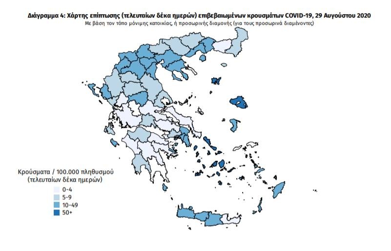 Ο χάρτης αποτυπώνει τη γεωγραφική κατανομή των συνολικών κρουσμάτων COVID-19 (από την αρχή της επιδημίας) ανά Περιφερειακή Ενότητα της χώρας, με βάση την δηλωθείσα διεύθυνση μόνιμης κατοικίας του ασθενούς, ή τη διεύθυνση προσωρινής διαμονής για τους τουρίστες και άλλους προσωρινά διαμένοντες στην Ελλάδα. Συμπεριλαμβάνονται τόσο κρούσματα με ιστορικό ταξιδίου («εισαγόμενα») όσο και κρούσματα με πιθανή εγχώρια μετάδοση.