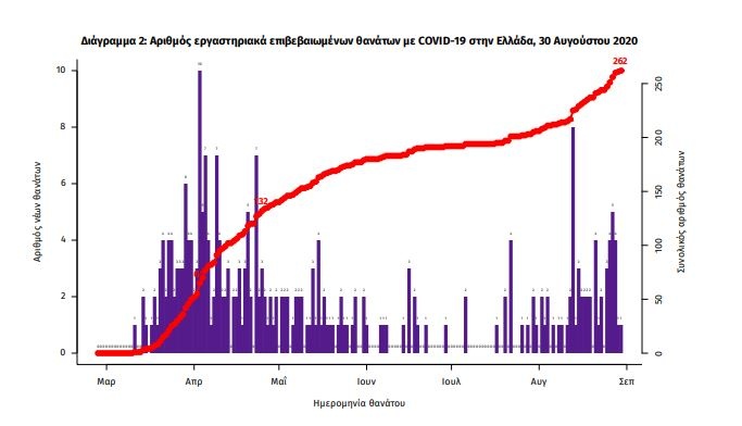 Τέλος, έχουμε 2 ακόμα καταγεγραμμένους θανάτους και 262 θανάτους συνολικά στη χώρα. 93 (35.5%) γυναίκες και οι υπόλοιποι άνδρες. Η διάμεση ηλικία των θανόντων συμπολιτών μας ήταν τα 77 έτη και το 93.5% είχε κάποιο υποκείμενο νόσημα ή/και ηλικία 70 ετών και άνω.