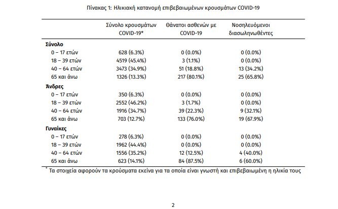 Τέλος, έχουμε 5 ακόμα καταγεγραμμένους θανάτους και 271 θανάτους συνολικά στη χώρα. 97 (35.8%) γυναίκες και οι υπόλοιποι άνδρες. Η διάμεση ηλικία των θανόντων συμπολιτών μας ήταν τα 78 έτη και το 95.9% είχε κάποιο υποκείμενο νόσημα ή/και ηλικία 70 ετών και άνω.