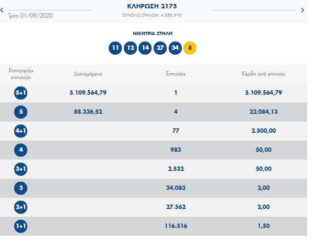 Οι τυχεροί αριθμοί που ανέδειξε η κληρωτίδα της αποψινής κλήρωσης είναι οι: 11, 12, 14, 27, 34 και Τζόκερ ο αριθμός 8.