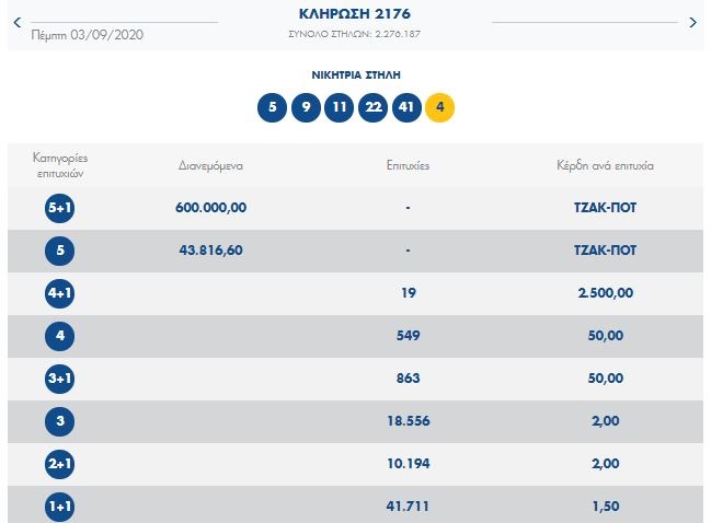 Οι αριθμοί που ανέδειξε η κληρωτίδα της αποψινής κλήρωσης είναι οι: 5, 9, 11, 22, 41 και Τζόκερ: 4.