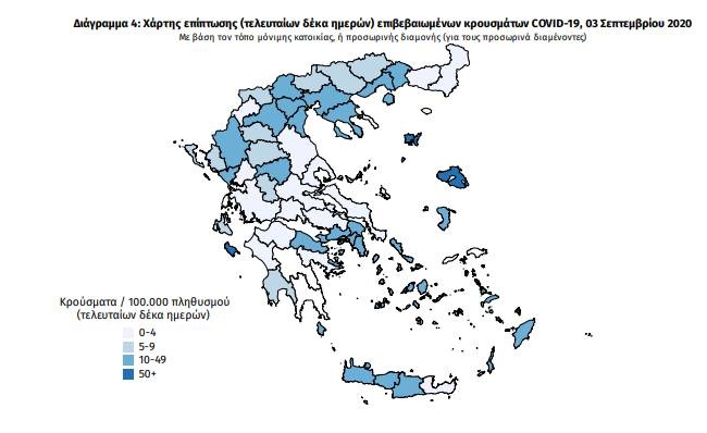 Ο χάρτης αποτυπώνει τη γεωγραφική κατανομή των συνολικών κρουσμάτων COVID-19 (από την αρχή της επιδημίας) ανά Περιφερειακή Ενότητα της χώρας, με βάση την δηλωθείσα διεύθυνση μόνιμης κατοικίας του ασθενούς, ή τη διεύθυνση προσωρινής διαμονής για τους τουρίστες και άλλους προσωρινά διαμένοντες στην Ελλάδα. Συμπεριλαμβάνονται τόσο κρούσματα με ιστορικό ταξιδίου («εισαγόμενα») όσο και κρούσματα με πιθανή εγχώρια μετάδοση.