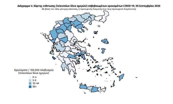 Ο χάρτης αποτυπώνει τη γεωγραφική κατανομή των συνολικών κρουσμάτων COVID-19 (από την αρχή της επιδημίας) ανά Περιφερειακή Ενότητα της χώρας, με βάση την δηλωθείσα διεύθυνση μόνιμης κατοικίας του ασθενούς, ή τη διεύθυνση προσωρινής διαμονής για τους τουρίστες και άλλους προσωρινά διαμένοντες στην Ελλάδα. Συμπεριλαμβάνονται τόσο κρούσματα με ιστορικό ταξιδίου («εισαγόμενα») όσο και κρούσματα με πιθανή εγχώρια μετάδοση.