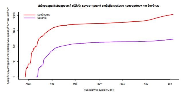 Η διαχρονική εξέλιξη των συνολικών κρουσμάτων και συνολικού αριθμού των θανάτων ασθενών COVID-19 παρουσιάζεται στο ακόλουθο διάγραμμα (σε λογαριθμική κλίμακα).