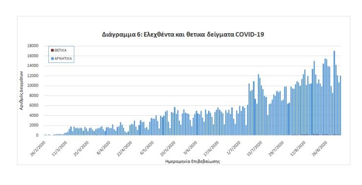 Δείγματα που έχουν ελεγχθεί στα συνεργαζόμενα με τον ΕΟΔΥ εργαστήρια: Από την 1η Ιανουαρίου 2020 μέχρι σήμερα, στα εργαστήρια που διενεργούν ελέγχους για τον νέο κορονοϊό (SARS-CoV-2) και που δηλώνουν συστηματικά στον ΕΟΔΥ το σύνολο των δειγμάτων που ελέγχουν (θετικά και αρνητικά), έχουν συνολικά ελεγχθεί 1.015.064 κλινικά δείγματα, εκ των οποίων τα 11.401(1.12%) ήταν θετικά στον κορoνοϊό (συμπεριλαμβάνονται και περισσότερα από ένα δείγματα ανά άτομο που ελέγχθηκε).