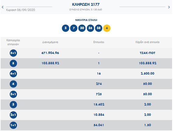Υπενθυμίζεται ότι οι τυχεροί αριθμοί που είχε αναδείξει η κληρωτίδα της κυριακάτικης κλήρωσης ήταν οι: 3, 7, 30, 35, 38 και Τζόκερ ο αριθμός 4.
