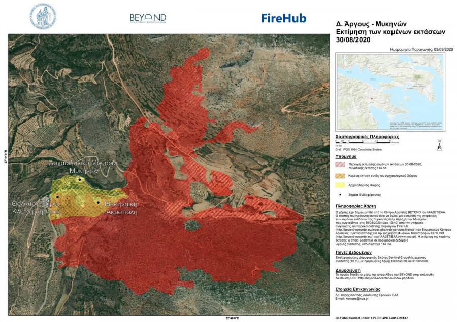 Νέα στοιχεία για τα σημεία που έπληξε η πυρκαγιά που ξέσπασε στις 30 Αυγούστου στον αρχαιολογικό χώρο των Μυκηνών έδωσε στη δημοσιότητα το Κέντρο Επιστημών Παρατήρησης της Γης και Δορυφορικής Τηλεπισκόπησης BEYOND του Ινστιτούτου Αστρονομίας και Αστροφυσικής του Εθνικού Αστεροσκοπείου Αθηνών.
