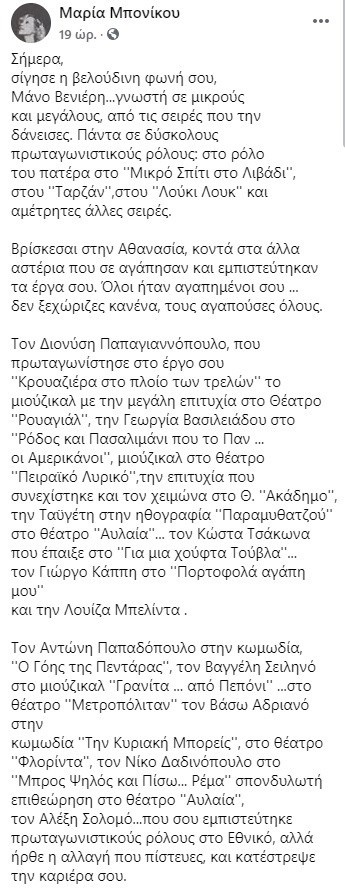 «Σήμερα, σίγησε η βελούδινη φωνή σου, Μάνο Βενιέρη…γνωστή σε μικρούς και μεγάλους, από τις σειρές που την δάνεισες. Πάντα σε δύσκολους πρωταγωνιστικούς ρόλους: στο ρόλο του πατέρα στο ”Μικρό Σπίτι στο Λιβάδι”, στου ”Ταρζάν”,στου ”Λούκι Λουκ” και αμέτρητες άλλες σειρές. Βρίσκεσαι στην Αθανασία, κοντά στα άλλα αστέρια που σε αγάπησαν και εμπιστεύτηκαν τα έργα σου. Όλοι ήταν αγαπημένοι σου … δεν ξεχώριζες κανένα, τους αγαπούσες όλους. Τον Διονύση Παπαγιαννόπουλο, που πρωταγωνίστησε στο έργο σου ”Κρουαζιέρα στο πλοίο των τρελών” το μιούζικαλ με την μεγάλη επιτυχία στο Θέατρο ”Ρουαγιάλ”, την Γεωργία Βασιλειάδου στο ”Ρόδος και Πασαλιμάνι που το Παν … οι Αμερικάνοι”, μιούζικαλ στο θέατρο ”Πειραϊκό Λυρικό”,την επιτυχία που συνεχίστηκε και τον χειμώνα στο Θ. ”Ακάδημο”, την Ταϋγέτη στην ηθογραφία ”Παραμυθατζού” στο θέατρο ”Αυλαία”… τον Κώστα Τσάκωνα που έπαιξε στο ”Για μια χούφτα Τούβλα”… τον Γιώργο Κάππη στο ”Πορτοφολά αγάπη μου” και την Λουίζα Μπελίντα . Τον Αντώνη Παπαδόπουλο στην κωμωδία, ”Ο Γόης της Πεντάρας”, τον Βαγγέλη Σειληνό στο μιούζικαλ ”Γρανίτα … από Πεπόνι” …στο θέατρο ”Μετροπόλιταν” τον Βάσω Αδριανό στην κωμωδία ”Την Κυριακή Μπορείς”, στο θέατρο ”Φλορίντα”, τον Νίκο Δαδινόπουλο στο ”Μπρος Ψηλός και Πίσω… Ρέμα” σπονδυλωτή επιθεώρηση στο θέατρο ”Αυλαία”, τον Αλέξη Σολομό…που σου εμπιστεύτηκε πρωταγωνιστικούς ρόλους στο Εθνικό, αλλά ήρθε η αλλαγή που πίστευες, και κατέστρεψε την καριέρα σου. Στην Έλενα Ναθαναήλ, που πρωταγωνίστησε στο σήριαλ ”Θωμάς επί Κολωνώ”, τον Χάρρυ Κλιν που του έγραφες για το ραδιόφωνο τον ”Μπάμπη τον Παιχταρά”..