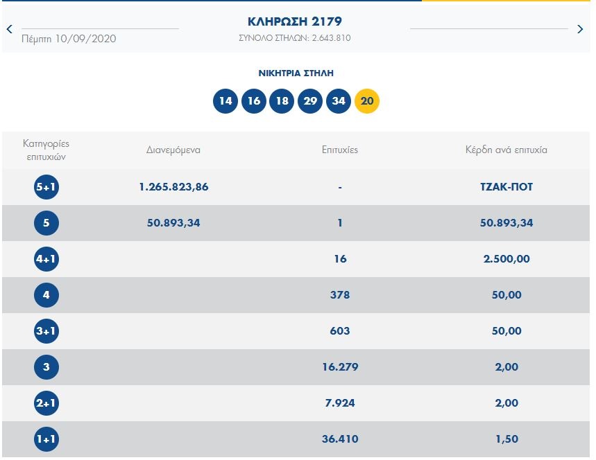 Οι τυχεροί αριθμοί που ανέδειξε η κληρωτίδα της αποψινής κλήρωσης είναι οι: 14, 16, 18, 29, 34 και Τζόκερ ο αριθμός 20.