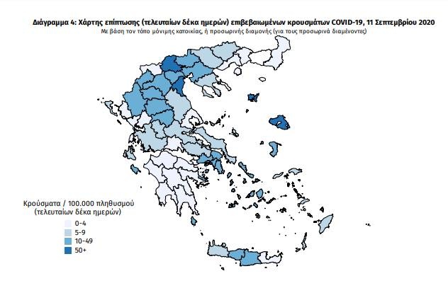 Ο χάρτης αποτυπώνει τη γεωγραφική κατανομή των συνολικών κρουσμάτων COVID-19 (από την αρχή της επιδημίας) ανά Περιφερειακή Ενότητα της χώρας, με βάση την δηλωθείσα διεύθυνση μόνιμης κατοικίας του ασθενούς, ή τη διεύθυνση προσωρινής διαμονής για τους τουρίστες και άλλους προσωρινά διαμένοντες στην Ελλάδα. Συμπεριλαμβάνονται τόσο κρούσματα με ιστορικό ταξιδίου («εισαγόμενα») όσο και κρούσματα με πιθανή εγχώρια μετάδοση.