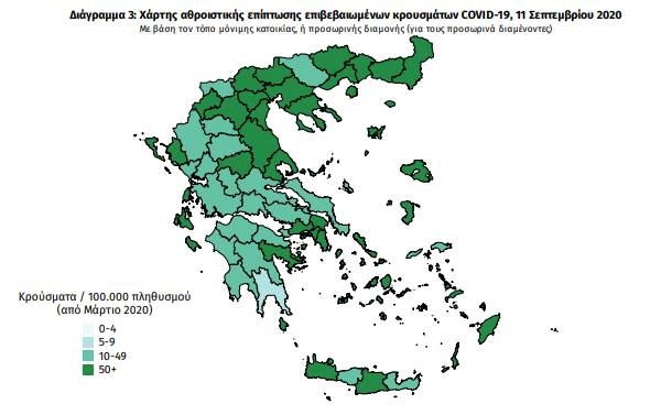Ο χάρτης αποτυπώνει τη γεωγραφική κατανομή των συνολικών κρουσμάτων COVID-19 (από την αρχή της επιδημίας) ανά Περιφερειακή Ενότητα της χώρας, με βάση την δηλωθείσα διεύθυνση μόνιμης κατοικίας του ασθενούς, ή τη διεύθυνση προσωρινής διαμονής για τους τουρίστες και άλλους προσωρινά διαμένοντες στην Ελλάδα. Συμπεριλαμβάνονται τόσο κρούσματα με ιστορικό ταξιδίου («εισαγόμενα») όσο και κρούσματα με πιθανή εγχώρια μετάδοση.