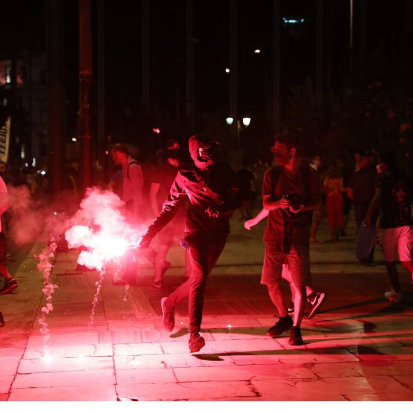 Συγκεκριμένα, όταν οι διαδηλωτές έφτασαν στη Βουλή, μία ομάδα περίπου δέκα νεαρών πέταξαν μία φωτοβολίδα προς την πλευρά των αστυνομικών δυνάμεων, μπροστά από τους Εύζωνες, καθώς και κάποιες πέτρες.